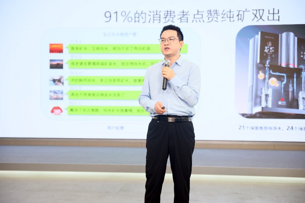 随后,刘总分享了该产品自发布以来的用户调研数据,报告显示,91%的受访消费者喜欢黄金比矿物质饮水机纯水、矿物质水双出的功能,表示均衡饮水很重要;而有72%消费者认为在矿物质水中的钙镁比例可视化这一功能很人性,能让人喝得更放心。